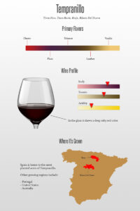 Ισπανία: Η Ισπανία είναι το απόλυτο βασίλειο του Tempranillo, όπου καλύπτει περίπου 400.000 εκτάρια. Rioja DOCa: η πιο εμβληματική περιοχή· τα κρασιά είναι κομψά, αρωματικά, με μεγάλη δυνατότητα παλαίωσης. Ribera del Duero DO: πιο δυναμικά, πλούσια και δομημένα κρασιά με ένταση και βάθος. Toro DO: προσφέρει στιβαρά, γεμάτα σώμα κρασιά, με πιο άγριο χαρακτήρα. La Mancha και Valdepeñas: πιο προσιτά και φρουτώδη Tempranillo.